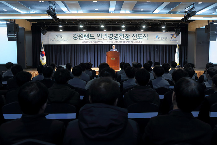 [로컬세계 박상진 기자]강원랜드(대표이사 문태곤)는 7일 하이원 그랜드호텔 그랜드볼룸에서 ‘강원랜드 인권경영헌장 선포식’을 열어 공공기관으로서의 인권 보호 및 존중 의무를 다하기 위한 실천의지를 천명했다고 밝혔다.