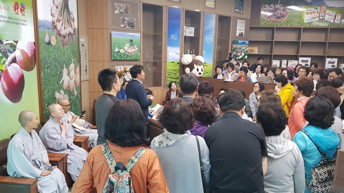 이날 행사에는 조계사 선림원장 남전스님, 포교국장 상범스님, 템플국장 자윤스님을 비롯한 신도 80여 명이 참석해 의성마늘의 생산, 유통, 가공과정 및 의성사과 선별, 품질관리 등을 견학하고, 의성군 다인면에 위치한 대곡사를 방문했다.