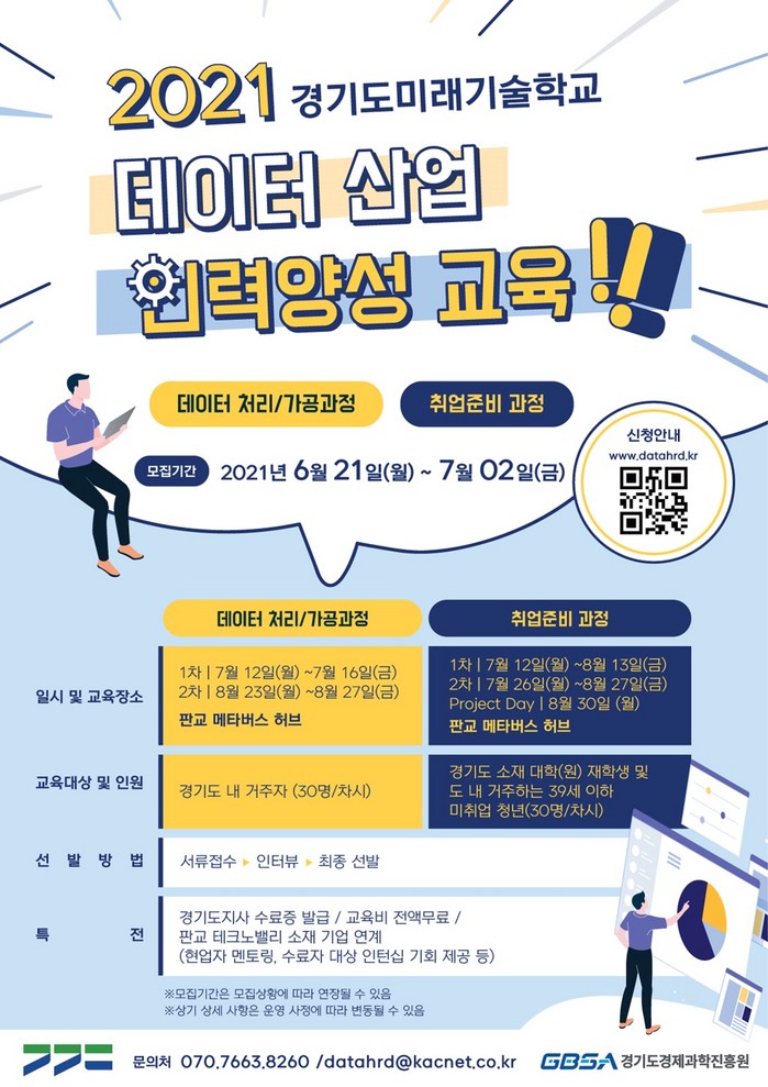 이번 과정은 ▲데이터 처리/가공 과정 ▲취업준비 과정 ▲재직자 과정으로 이뤄진 총 3개 과정으로 운영되며, 교육 대상자는 관심 있는 경기도민, 도내 대학(원) 재학생, 재직자 등으로, 7월부터 데이터 처리/가공 과정 및 취업준비 과정이 진행된다.