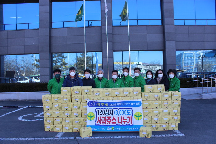 이날 전달된 사과주스 3,600포(250만 원 상당)는 장진상 구천면협의회장이 직접 농사지은 사과로 만들었으며, 관내 사회복지시설 믿음의 집을 비롯한 10개소에 기증했다.