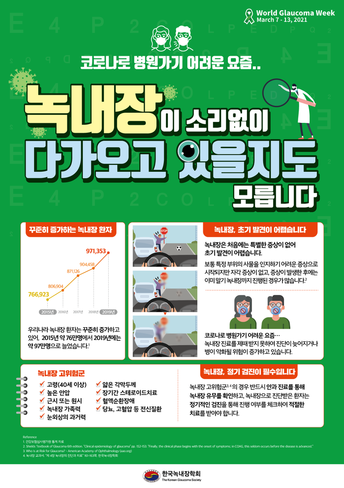 한국녹내장학회는 2021년 세계녹내장주간(World Glaucoma Week)을 맞아 ‘코로나19 속에서도 녹내장 검진을 챙기세요’를 주제로 3월 7일부터 13일까지 한 주간 캠페인을 실시한다고 밝혔다.