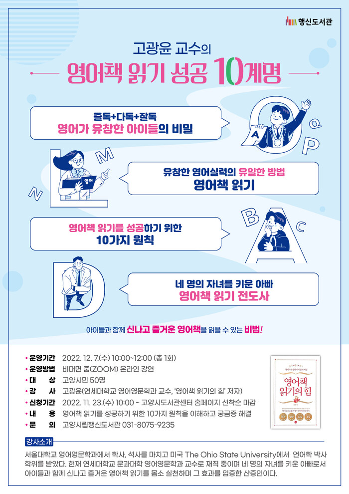 [로컬세계 = 이영원 기자]경기 고양특례시 행신도서관이 12월 7일 독서문화프로그램 '고광윤 교수의 영어책 읽기 성공 10계명'을 온라인으로 운영한다.