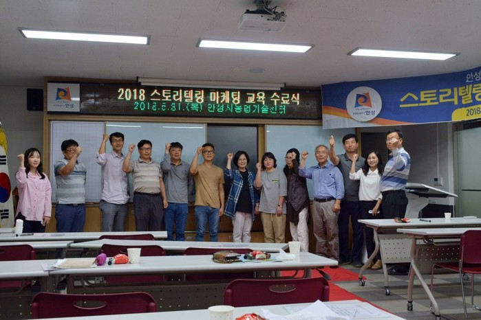 | ▲2018 스토리텔링 마케팅 교육을 받은 수강생들이 파이팅을 외치고 있다.(안성시 제공) |