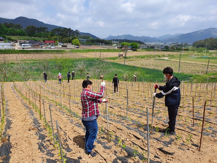농촌일손 돕기는 민원 처리 등 필수인원을 제외한 산림공원과 16명이 농가 3곳을 방문해 전체 4500㎡ 면적의 고추밭에서 지주대와 고정끈 설치 작업을 도왔다.