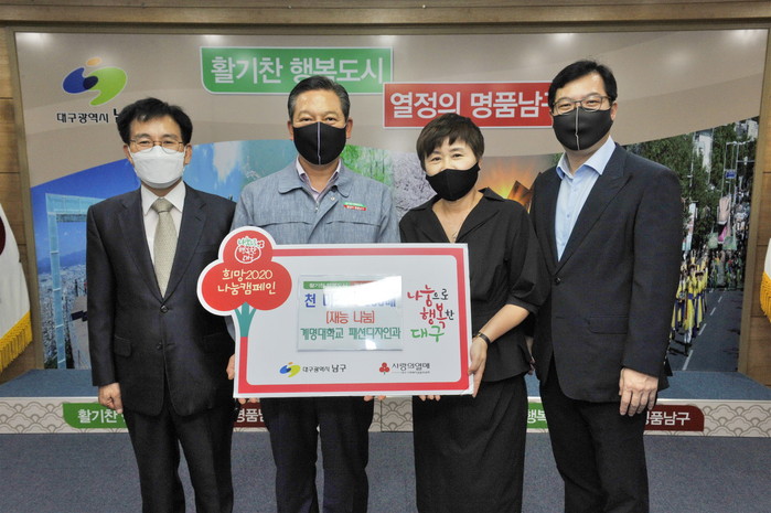 [로컬세계 박세환 기자]대구 남구청은 지난 28일 계명대학교 패션디자인과에서 ‘코로나19 극복 희망나눔 캠페인’의 일환으로 패션디자인과 학생들이 재능나눔으로 직접 만든 특수재질 천마스크 600매를 전달했다고 31일 밝혔다.