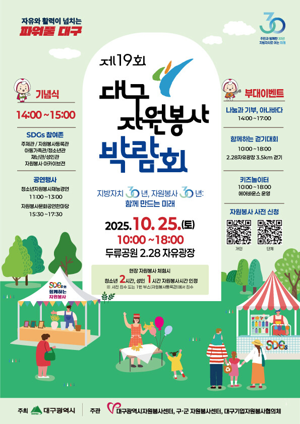 특히 자원봉사 아카이브 전시관에서는 대구 자원봉사 30년의 역사를 돌아보고, 산불 피해 복구 등 재난 극복과 지역사회 발전을 위해 헌신한 자원봉사자들의 활동을 조명한다.