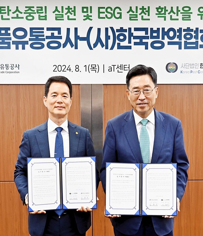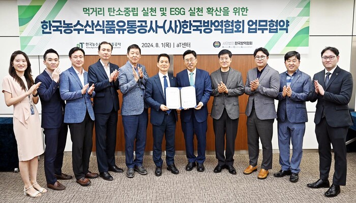 한국농수산식품유통공사(사장 김춘진)와 사단법인 한국방역협회(회장 김성수)는 1일 서울 양재동 aT센터에서 저탄소 식생활 확산과 ESG경영 강화를 위한 업무협약을 체결했다.