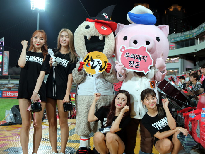▲우리돼지 한돈, 최고에요~!! 지난 23일, 수원케이티위즈파크에서 열린 kt위즈와 한화 이글스의 경기에서 치어리더들이 한돈 마스코트 한도니와 함께 기념사진을 촬영하며 즐거운 시간을 보내고 있다. |