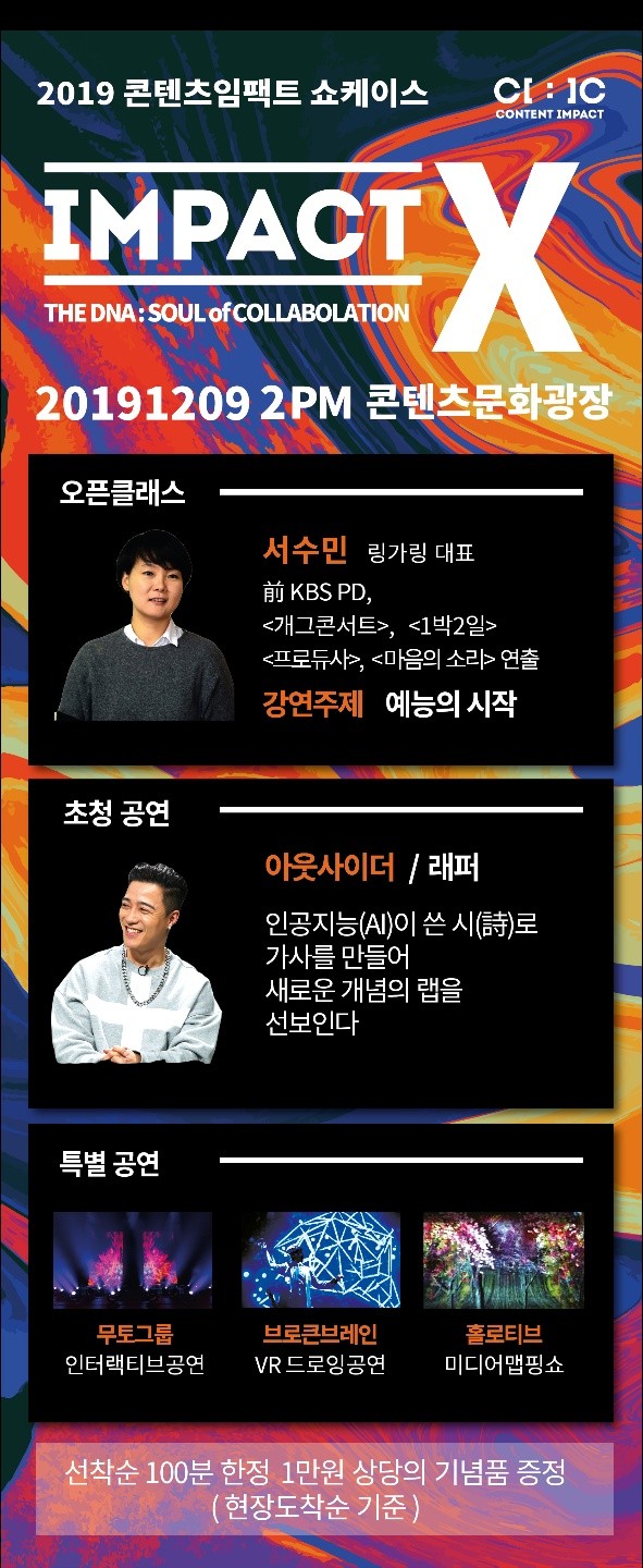 문화체육관광부와 한국콘텐츠진흥원(원장 김영준, 이하 콘진원)은 오는 9일 오후 2시부터 홍릉 콘텐츠문화광장과 콘텐츠인재캠퍼스에서 ‘콘텐츠임팩트 창의랩X혁신랩 통합 쇼케이스-Impact X’를 진행한다.