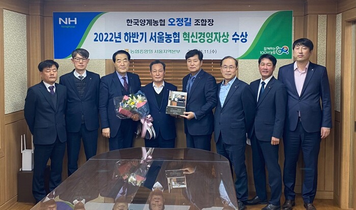 농협중앙회 서울본부(본부장 황준구)는 11일에 한국양계농협 본점에서 '2022년 하반기 서울농협 혁신경영자상' 시상식을 개최했다.