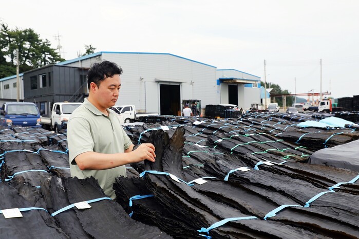 ▲농심 구매팀 담당자가 다시마 품질을 확인하고 있다. |