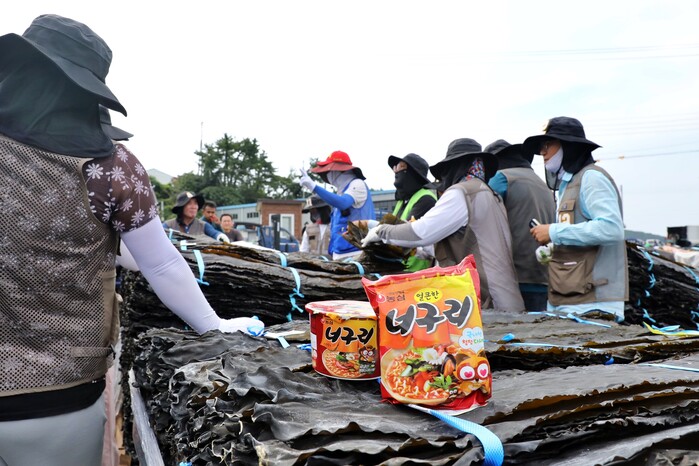 농심이 너구리 출시 이래로 매년 지켜온 완도 다시마와 인연을 올해도 이어간다. 농심은 최근 전남 완도군 금일도에서 진행된 다시마 위판(경매)에 참여해 너구리 생산에 사용할 햇다시마 355톤을 구매했다고 밝혔다.