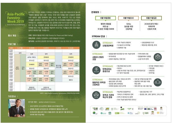 올해는 아시아 태평양 지역 46개국 1,500여 명의 정부대표단, 국제기구, 민간단체, 엔지오(NGO) 등이 모여 ‘평화와 웰빙을 위한 산림’이라는 주제를 갖고 기후변화, 산림황폐 등 글로벌 산림 이슈에 대해 논의하고 해결방안을 모색하는 자리를 갖는다.