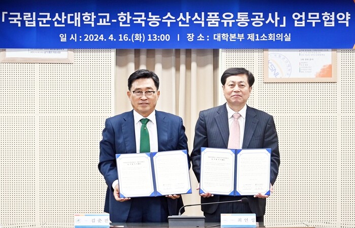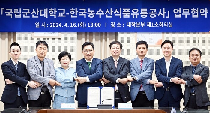 한국농수산식품유통공사(사장 김춘진)와 국립군산대학교는 16일 국립군산대학교에서 농수산식품 분야 미래 인재 육성과 저탄소 식생활 확산을 위한 업무협약을 체결했다.