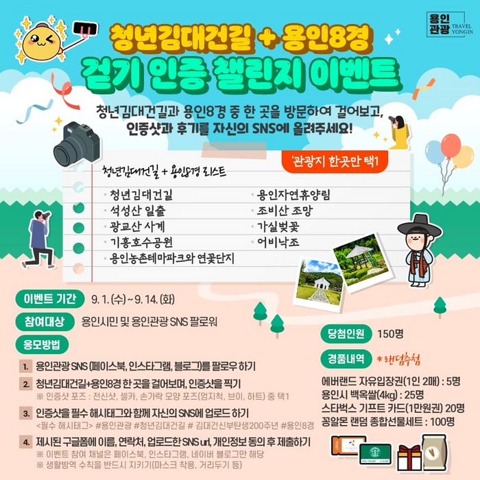 [로컬세계 김병민 기자]경기 용인시가 다음달 1일부터 14일까지 ‘청년 김대건길 + 용인 8경 걷기 인증 챌린지’ 이벤트를 진행한다고 30일 밝혔다.
