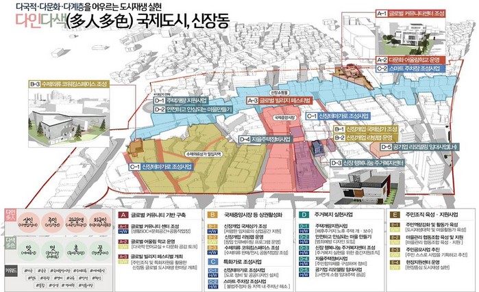 이번에 선정된 신장지역 뉴딜사업은 ‘다인다색(多人多色) 국제도시, 신장동’이 핵심 테마로 삼아 ▲노후된 신장 제1공영주차장을 이용한 다국적·다문화·다계층 문화허브 거점공간 조성 ▲지역 특화자산인 수제의류 브랜드화 ▲수제의류 코워킹 스페이스 조성 ▲국제중앙시장 활성화 ▲상가 내몰림 현상 대응을 위한 상생협력상가 조성 등이 추진돼 신장동 일대 지역 활성화에 크게 기여할 것으로 보인다.