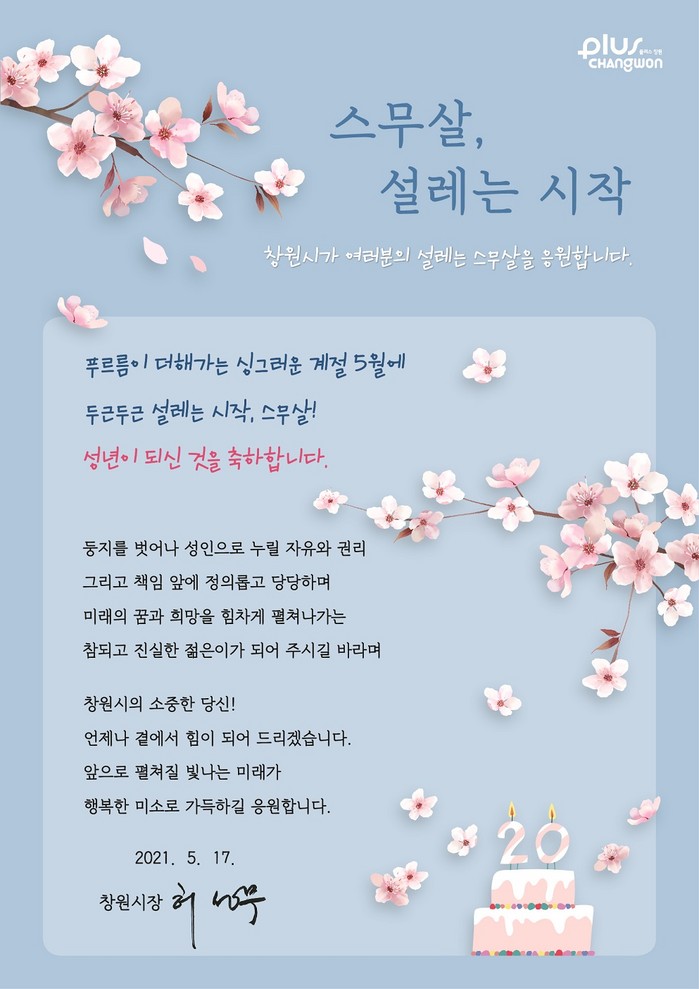 또 창원시 공식 SNS, 시청 홈페이지, 야외전광판 등에 스무살 성년이 됨을 축하하는 응원 메시지가 성년의 날 당일 송출된다.