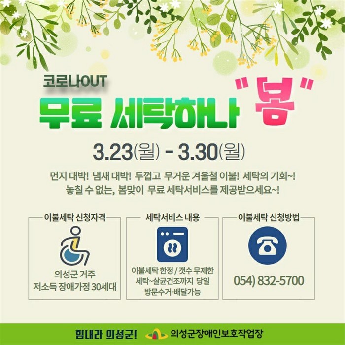 [로컬세계 박상진 기자]경북 의성군장애인보호작업장은 봄을 맞아 관내 저소득 장애인세대에 대한 무료 방역 및 이불세탁 서비스‘무료 세탁 하나 봄’을 실시한다고 26일 밝혔다.