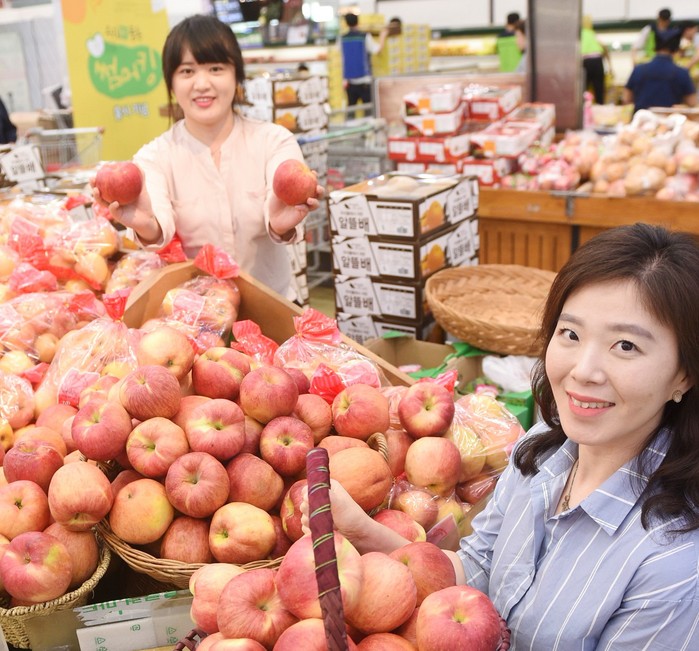 ▲11일 서울 서초구 농협하나로마트 양재점에서 모델들이 올해 첫 출하된 ‘홍로’사과를 선보이고 있다. 농협유통 하나로마트 양재점에서는 9월 16일까지 가을담은 홍로 햇사과(1.5kg/봉) 9,970원→7,980원으로 20% 할인 판매하며, 일부 흠이 있지만 맛과 품질에는 영향이 없는 홍로를 낱개 1,600원, 골라담기(7개) 9,980원으로 판매한다.(농협유통 제공) |