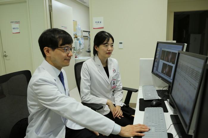 ▲한림대강남성심병원 의료진들이 협진을 통해 환자의 수면 상태를 점검하고 있다. |