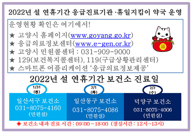 설 연휴 내 의료기관 및 약국 운영 여부와 구급차 출동, 코로나19 선별진료소 등에 대한 문의는 보건소와 고양시민원콜센터, 구급상황관리센터, 보건복지콜센터로 하면 된다.