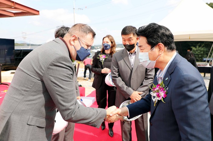 | ▲▲백군기 시장이 14일 처인구 원삼면 원삼일반산단 내 (주)나노엑스코리아 의료장비 반도체 생산 공장 사전 준공식에 참석에 란 폴리아키네 (주)나노엑스이스라엘 회장과 인사를 하고 있다. |