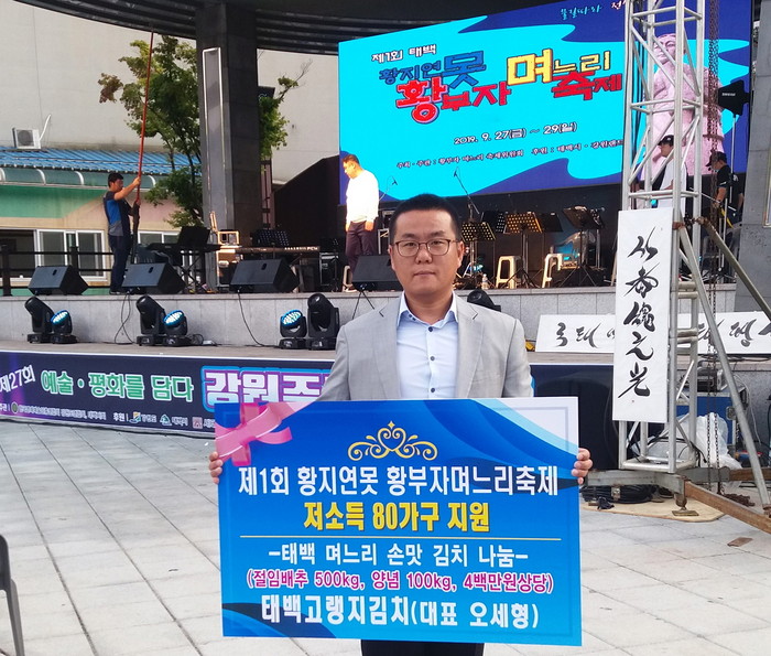 [로컬세계 박상진 기자]강원 태백시는 철암농공단지 입주기업인 태백고랭지김치(대표 오세형)가 지난 29일 제1회 태백시 황지연못 황부자 며느리 축제행사의 일환으로 개최된 태백며느리 손맛 김치 나눔에 절임배추 500kg와 양념100kg(4백만원 상당)을 후원했다고 30일 밝혔다.