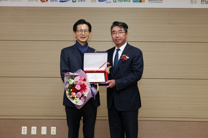 ▲유기상 군수(왼쪽)가 지난 2일 전남대학교 진리관에서 진행된 시상식에서 수상 후 기념촬영을 하고 있다.(고창군 제공) |
