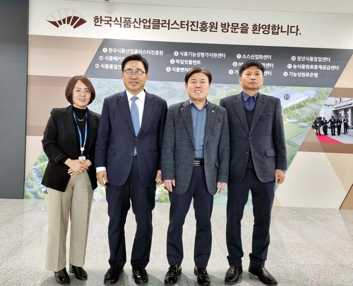 ▲한국식품산업클러스터진흥원 방문 사진. 한국농수산식품유통공사 김춘진 사장(좌측 2번째), 한국식품산업클러스터진흥원 김영재 이사장(좌측 3번째) |