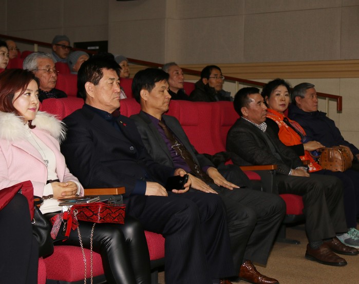 ▲(앞줄 왼쪽부터) 이명순 아나운서, 이강춘 대전서구문화원장, 김근종 대전시설관리공단 이사장 등이 공연을 관람하고 있다. |