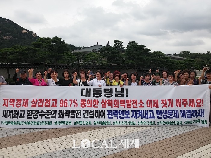 [로컬세계 김재덕 기자]삼척시 한국예술문화단체총연합회 삼척지회 회원 40여 명은 17일 청와대 분수 광장에서 포스파워 삼척화력발전소 조기건설 촉구 결의대회를 갖고 청와대에 호소문을 전달했다.