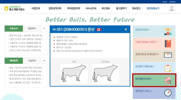 젖소개량사업소에 유전체 자료를 제공한 농가는 홈페이지 내 '유전체 분석 조회' 배너에 접속해 유전체분석 결과 리포트를 활용할 수 있으며, 본 서비스를 이용하면 국내 환경을 반영한 국내 유전능력평가 결과를 활용해 신뢰도 높은 육종가를 예측할 수 있다.