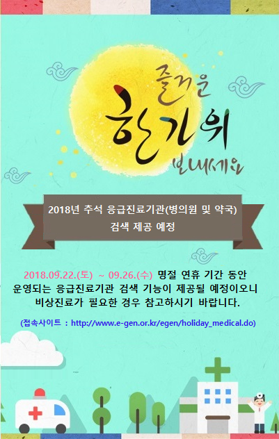 추석 연휴 당직의료기관과 휴일지킴이 약국은 119 응급정보센터(국번없이 119), 보건복지콜센터(국번없이 129)나 강릉시보건소(660-3000)에 문의하면 신속하게 안내 받을 수 있다.