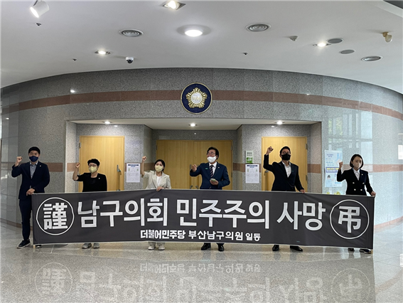 ▲부산 남구의회 더불어민주당 소속 의원들이 27일 구의회 본회의장 앞에서 국민의힘 일방독주에 대해 강력히 항의하는 '근조' '남구의회 민주주의 사망' 문구가 적힌 현수막을 펼쳐든 채 시위를 하고 있다. |