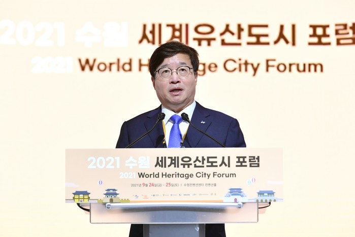 | ▲염태영 시장이 24일 수원컨벤션센터에서 열린 ‘2021 수원 세계유산도시 포럼’ 개회식에서 연설을 하고 있다.(수원시 제공) |