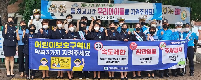 달서구는 용산초등학교 주변도로에서 성서녹색어머니회, 성서모범운전자회 등 교통봉사단체와 성서경찰서, 용산초등학교 등 40여 명이 참여한 민‧관 합동 캠페인을 실시했다.