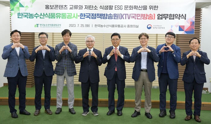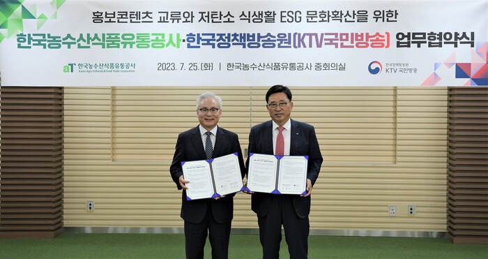 [로컬세계 = 이명호 기자] 한국농수산식품유통공사(사장 김춘진)는 25일 나주 본사에서 KTV국민방송과 함께 홍보콘텐츠 교류와 저탄소 식생활 ESG 문화확산을 위한 업무협약을 체결했다.
