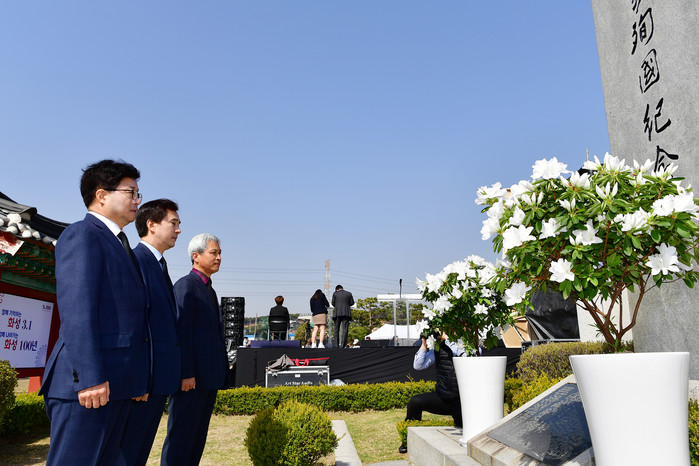 | ▲(왼쪽부터) 염태영 수원시장, 서철모 화성시장, 곽상욱 오산시장이 ‘화성4.15 100주년 제암·고주리학살사건추모제’에 참석해 100년 전 일제에 의해 학살당한 주민들의 합동 묘역을 참배하고 있다.(수원시 제공) |