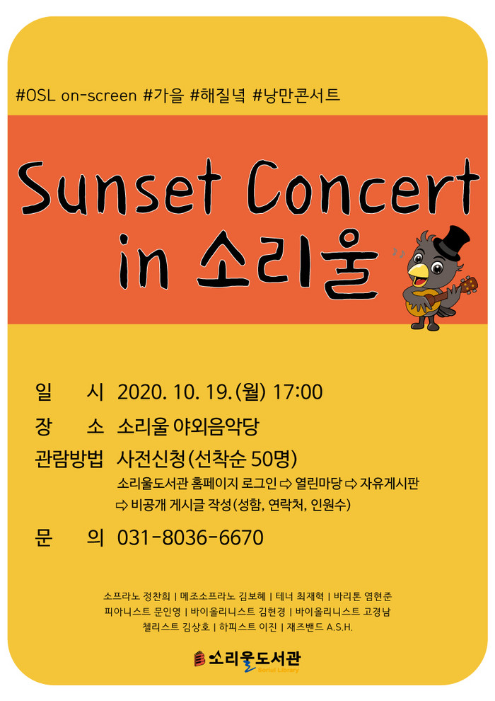 소리울도서관 관계자는 “소리울도서관 야외음악당에서 펼쳐지는 아름다운 음악의 향연으로 많은 시민분들이 힐링하는 시간을 가지시길 기대한다”며, “공연 현장에서는 마스크 착용, 거리두기 등 방역 수칙을 철저히 준수하겠다”고 말했다.