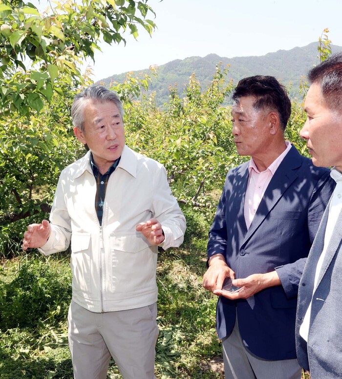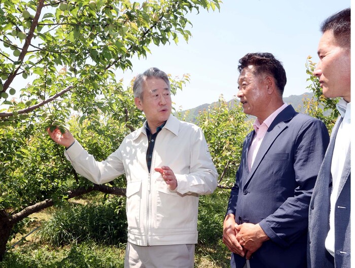 강호동 농협중앙회장이 3일 전국 3대 매실 주산지 중 하나인 경남 하동군의 매실 농가를 방문하여 생육 상황을 점검했다.