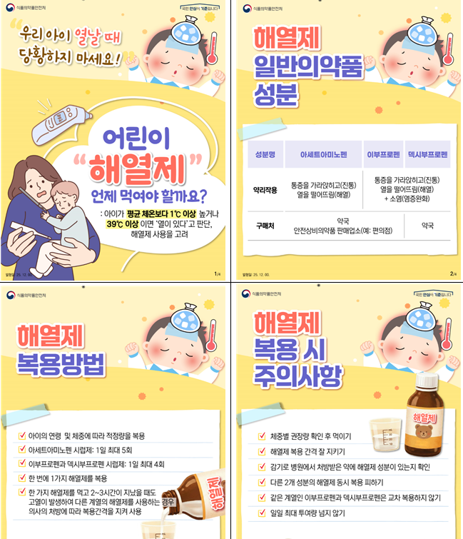 [로컬세계 = 길도원 기자] 식품의약품안전처 산하 식품의약품안전평가원은 겨울철 독감·감기 증가로 소아 해열제 사용이 늘어남에 따라 올바른 복용 방법과 주의사항을 안내했다. 갑작스런 고열이 나타났을 때 해열제를 언제, 얼마나 먹여야 하는지와 함께 과다 복용 시 위험성도 강조했다.