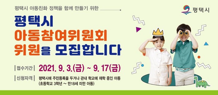 [로컬세계 김병민 기자]경기 평택시는 아동들의 자유롭고 적극적인 참여를 통해 아동권리관련 다양한 의견을 수렴해 실효성 있는 아동친화정책을 발굴・도입하고자 오는 3일부터 17일까지 ‘제2기 평택시 아동참여위원회’위원을 공개모집한다고 1일 밝혔다.