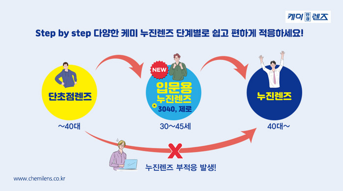 케미렌즈는 근거리 시야 불편함을 처음 느끼는 3040 연령층의 경우 입문형 `케미 3040’으로 누진렌즈에 적응을 하다가 40대 후반, 50대를 접어들면서, 본격적인 안구 조절힘 부족이 발생하면 일반 누진렌즈로 바꿔 자연스럽게 누진안경에 대한 적응을 할 수 있게 된다고 말했다.