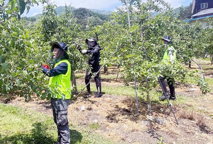 ▲산지도매본부 임직원 20여명이 강원도 철원군 김화읍에 위치한 사과농가를 방문하여 적과작업을 돕고 있다. |