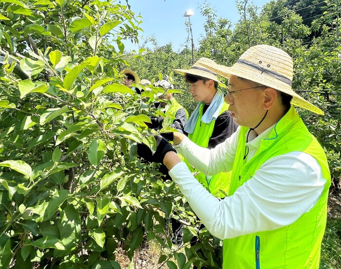 지난 21일에는 에너지사업부 직원 10여명이 충북 단양군 대강면 소재 농가를 찾아 사과 적과작업과 마을 환경정화 활동을 돕고 농업인 애로사항을 청취하는 등 현장지원 활동을 벌였다.