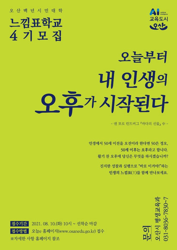 [로컬세계 김병민 기자]경기 오산시(시장 곽상욱)는 신중년 대상 평생학습 장기프로젝트 '오산백년시민대학 느낌표학교' 4기 신입생을 모집한다고 4일 밝혔다.