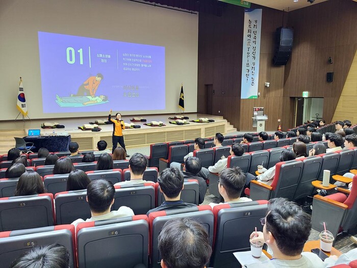 ▲ 2024년 농축협 신규직원이 경주소방서 소방대원의 심폐소생술 강의를 듣고 있다. |