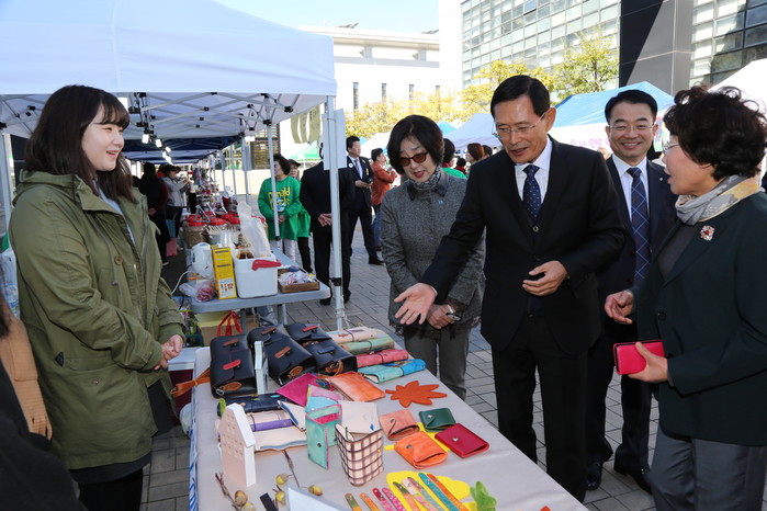 ▲참가자가 직접 만든 수공예품을 보고 있는 박동철 금산군수. |