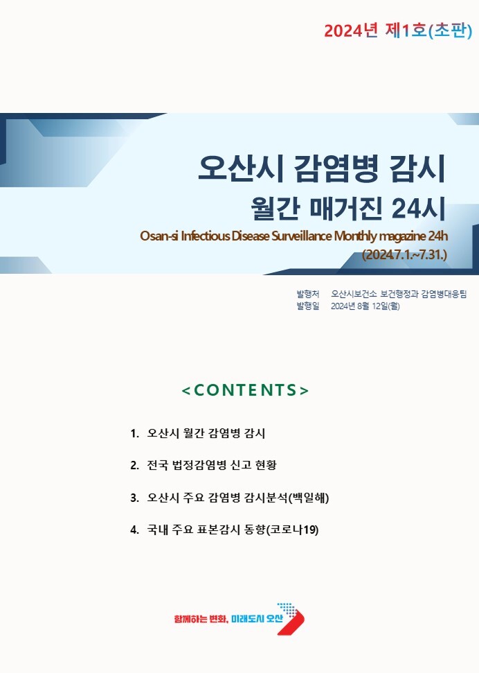 8월 창간호에는 김영민 역학조사관 분석자료를 토대로 ▲오산시 월간 감염병 감시 사항 ▲오산시 주요 감염병 감시분석(백일해) ▲전국 법정감염병 신고 현황 ▲국내 주요 표본감시 동향(코로나19)을 담고 있다.