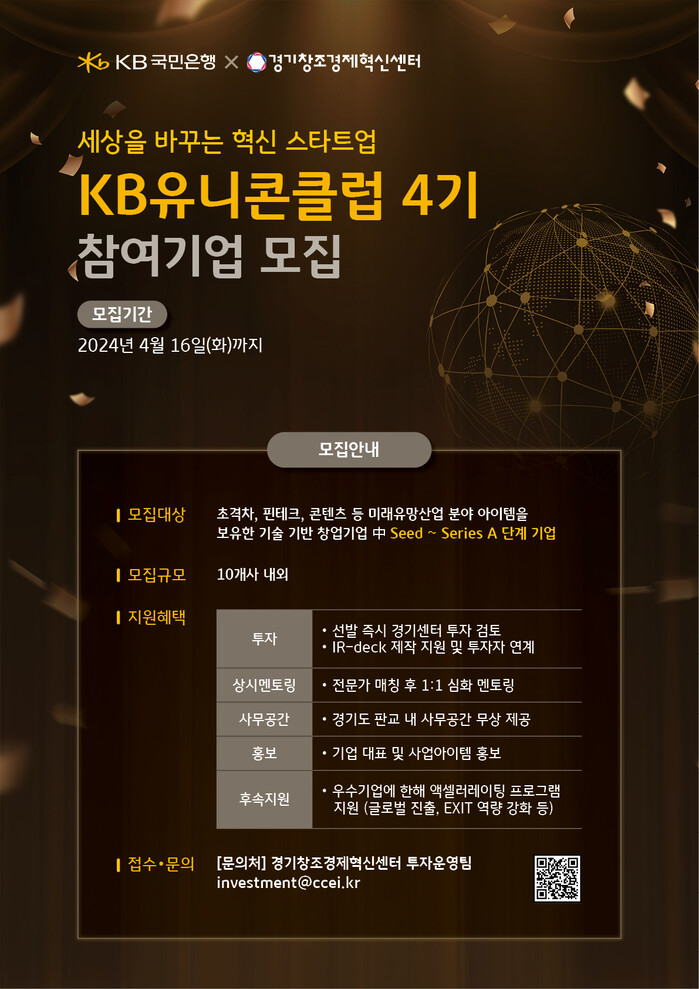 [로컬세계 = 마나미 기자] KB국민은행(은행장 이재근)이 지속가능한 사회를 위한 상생금융 실천의 일환으로 新산업 스타트업을 발굴·육성하는 'KB 유니콘 클럽' 4기를 모집한다.